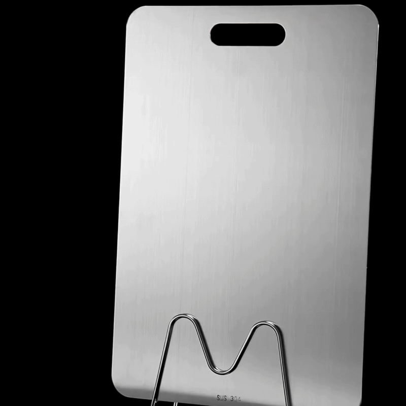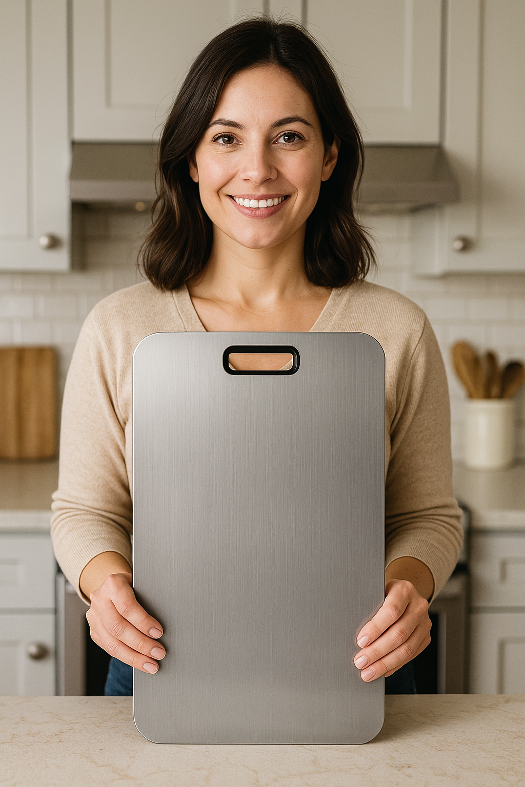 Nuestra tabla está hecha con titanio apto para uso alimentario (no es acero barato). A diferencia de muchas tablas “metálicas” del mercado, usamos materiales certificados para estar en contacto con alimentos.